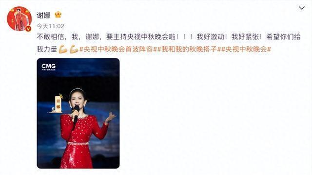 “不敢相信,我,谢娜,要主持央视中秋晚会啦!!!我好激动!我好紧张!希望你们给我力量。”10月4日,谢娜在社交媒体上连发两条微博,表达了自己首次主持央视中秋晚会的激动心情。