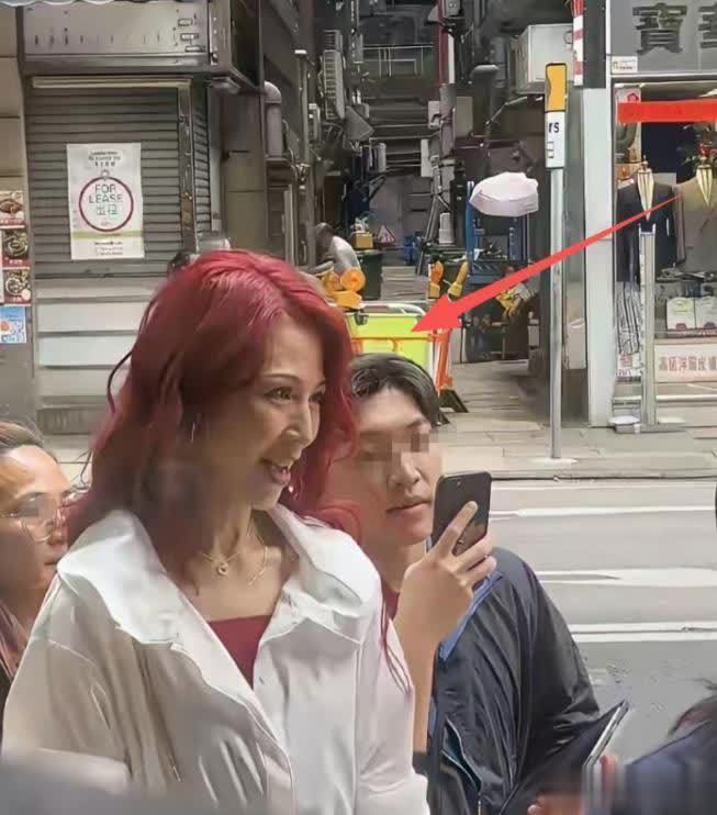 只见她穿着一件白色的衬衣,还把头发给染成了红色,咱就是说她这个年纪把头发给染成红色是不是真的为了显年轻啊,可是这样一看真的看不出来她年轻来。
